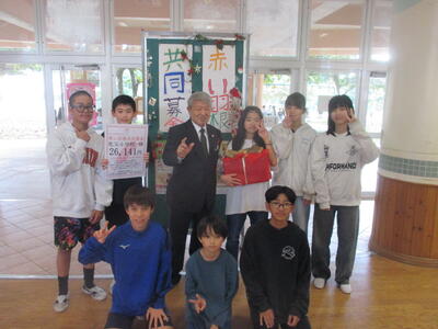 本校では、困っている皆さんに少しでも役に立ちたいという温かい気持ちで、赤い羽根共同募金活動に取り組んでいました。その、募金贈呈式を行いました。