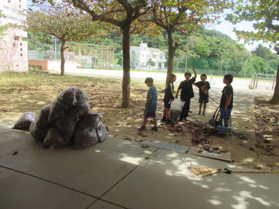 いっぱい落ち葉を集めて、一生懸命袋に入れています。掃除時間を過ぎていますが、楽しそうに掃除をしているんです。さすが、凄いぞ北玉っ子。みんなのためにありがとう。