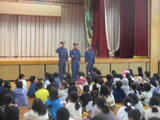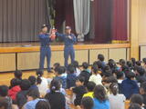 素早く、机の下にもぐり自分の身を守っています。体育館では、ニライ消防本部の方から消火器の使い方のレクチャも。