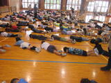 花火やバーベキューなどで万が一自分の衣服に火が付いたは、「ストップ、ドロップ&ロール」=走り回らずに「止まって(ストップ)」「倒れて(ドロップ)」「転がって(ロール)」火を消す方法の訓練もおこないました。