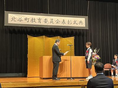 2月7日(土)、ニライセンターにて「北谷町教育委員会表彰式典」が行われ、本校から6年生の上原琉可さん、5年生の可兒太樹さんの2名が表彰されました。